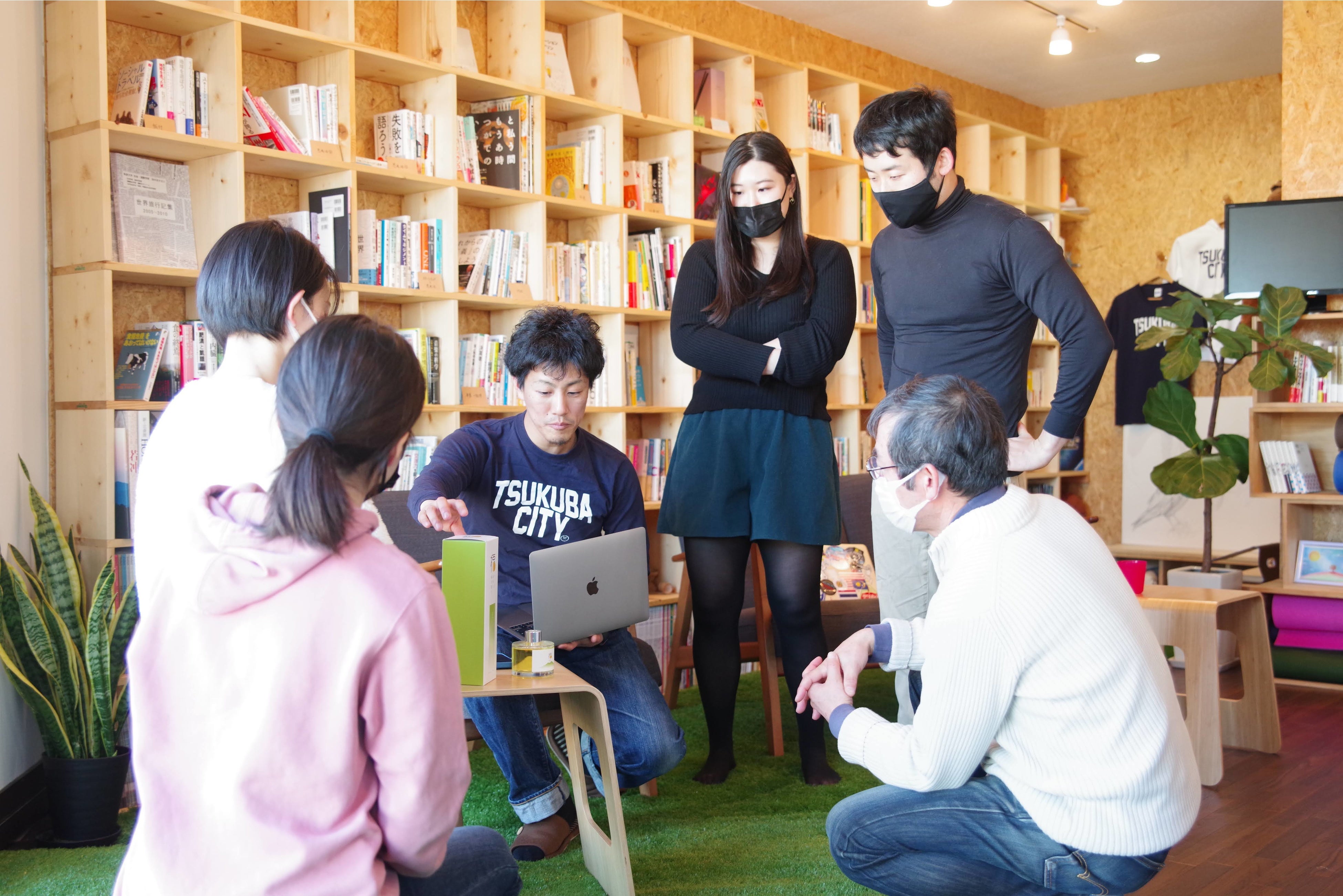 Tsukuba Place Labをオープンした当初から、香りも空間としてデザインしたいと思っていました。誰にとっても安心・安全な場を開き続けるということを創設以来5年間大事にし、この場の記憶と香りがセットになるといいなと考え、これまでもアロマディフューザーを使用してきました。日中は作業効率を考えフレッシュな香りを、夜間には気持ちを落ち着けるリラックスできる香りを。一方で "つくばらしくLabらしい" 香りを探求していました。 「ideal fashion」との出会いは、江本州陽さんがつくばに移住されたことがきっかけでした。起業する場所を探し求めつくばに移住された江本さんが香りを開発するスタートアップを経営されていることを知り、"つくばらしくLabらしい" 香りの開発を依頼。江本さん自身も「せっかくつくばでやるなら地域と関わる取り組みをしたい」という思いがあり、コラボレーションが始まりました。"つくばらしくLabらしい" をイメージして、さわやかな福来みかんの香りと、つくばの特産品でもありLabを想起させる青々しいエネルギッシュな芝の香りを組み合わせて、"つくば福来る風の香り" が誕生しました! 香りを販売するにあたって次に大事になってくるのがデザインでした。そんなデザインは、筑波大発のデザインプラットフォーム「unit X」を通じて出会った現役筑波大生デザイナーに依頼。きっかけは2019年春、筑波大学に編入してきたunit X代表の岡村未来さんがLabイベント「戦略的大学生のススメ」に参加してくれたことです。学生デザイナーの挑戦をお仕事の紹介で応援する「unit X」の活動に共感し、依頼することに決めました。完成したデザインは、つくばらしくLabらしい香りをうまく表現してくれる素敵なものになっています!